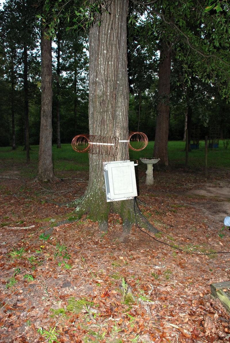 If you look carefully, you can just see the horizontal single wire antenna in the background in the far right side of the picture. That is my 160 meter dipole antenna, which is about 20 feet above the ground. The other antenna is the large Oak tree in the center of the picture. Near the base of the tree trunk is the coupling coil which surrounds the trunk.
