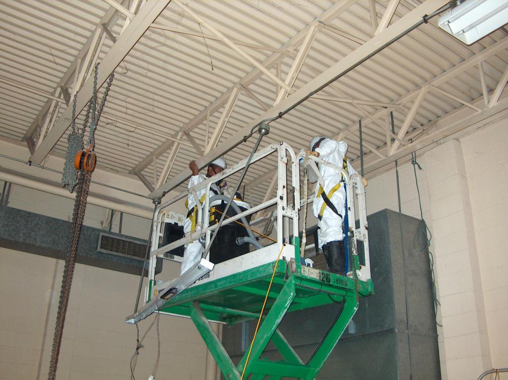 Some of the crew cleaning the interior of the garage. These guys wipe down - by hand - each and every section of pipe, wire, bracing, beam and girder with disinfectant.