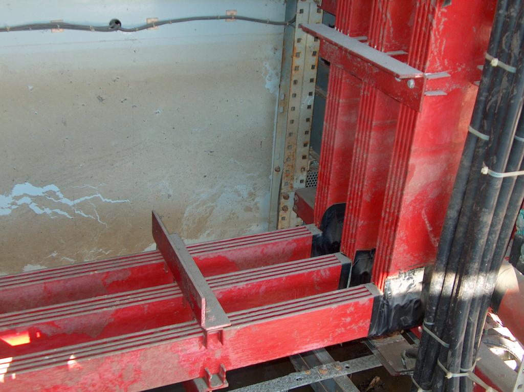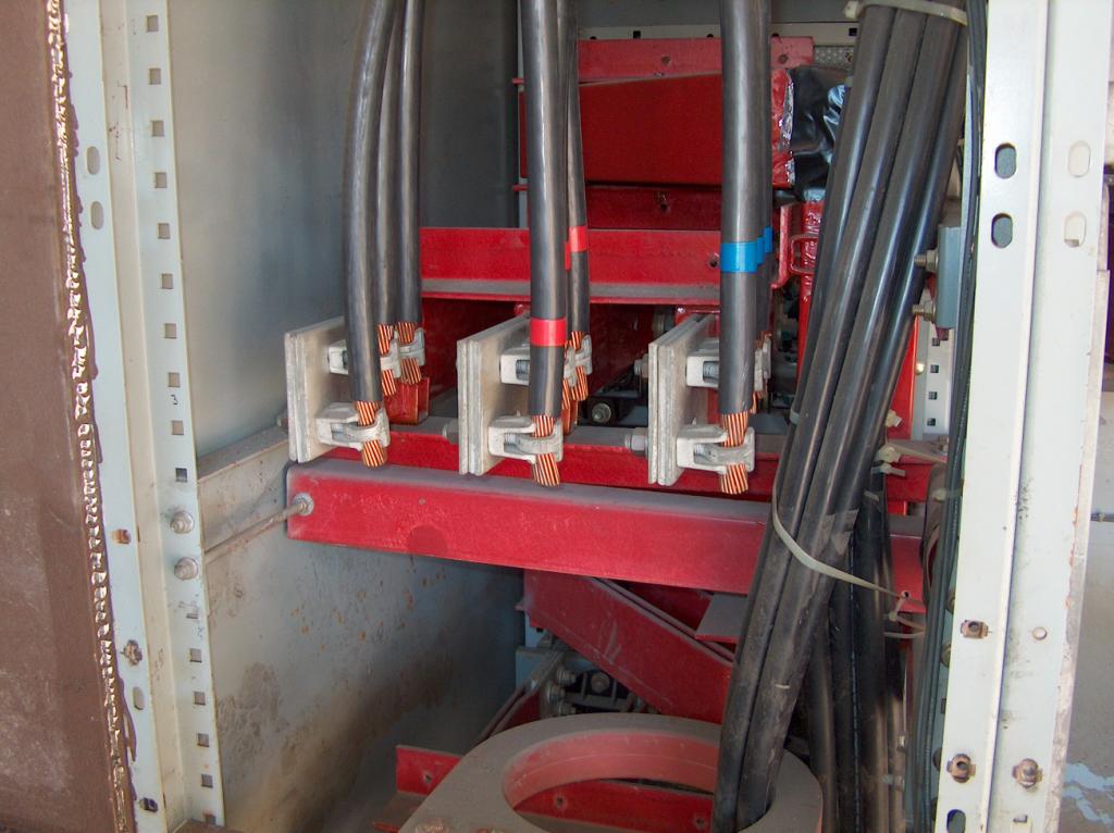 The rear of the main power switchboard. The red power busses carry the main power feed from ENTERGY.