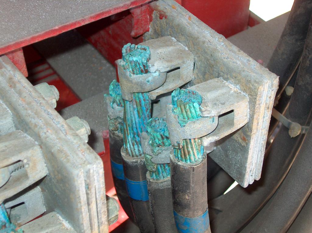 This is what the ends of the copper wires and the terminal connectors should look like. These did not get hit by the flood water.