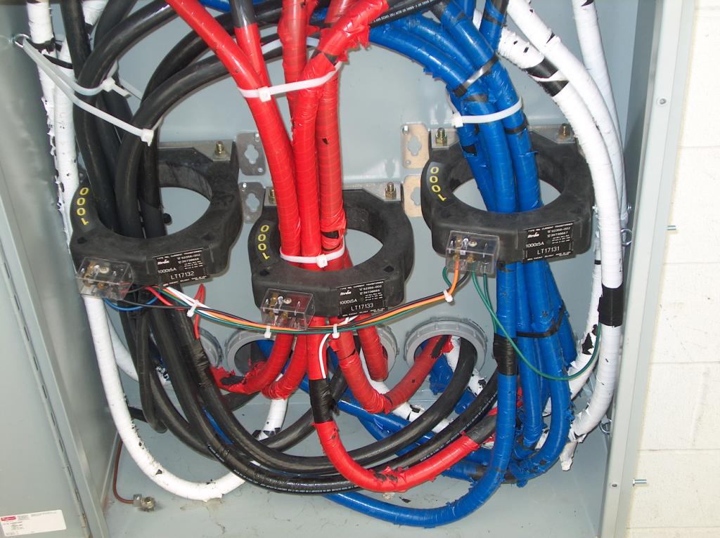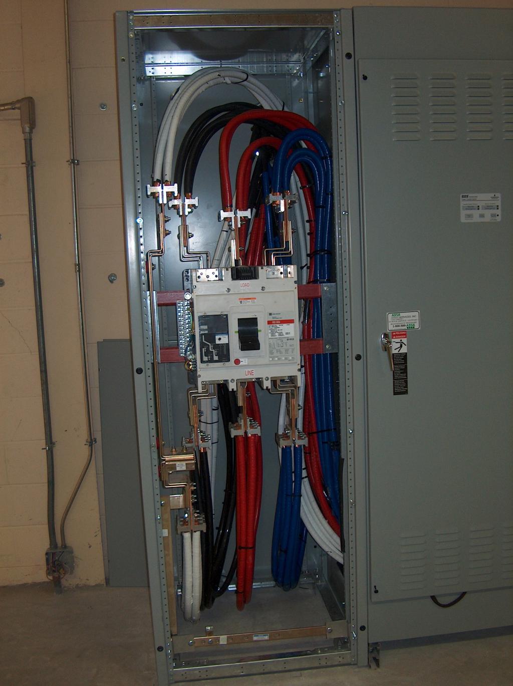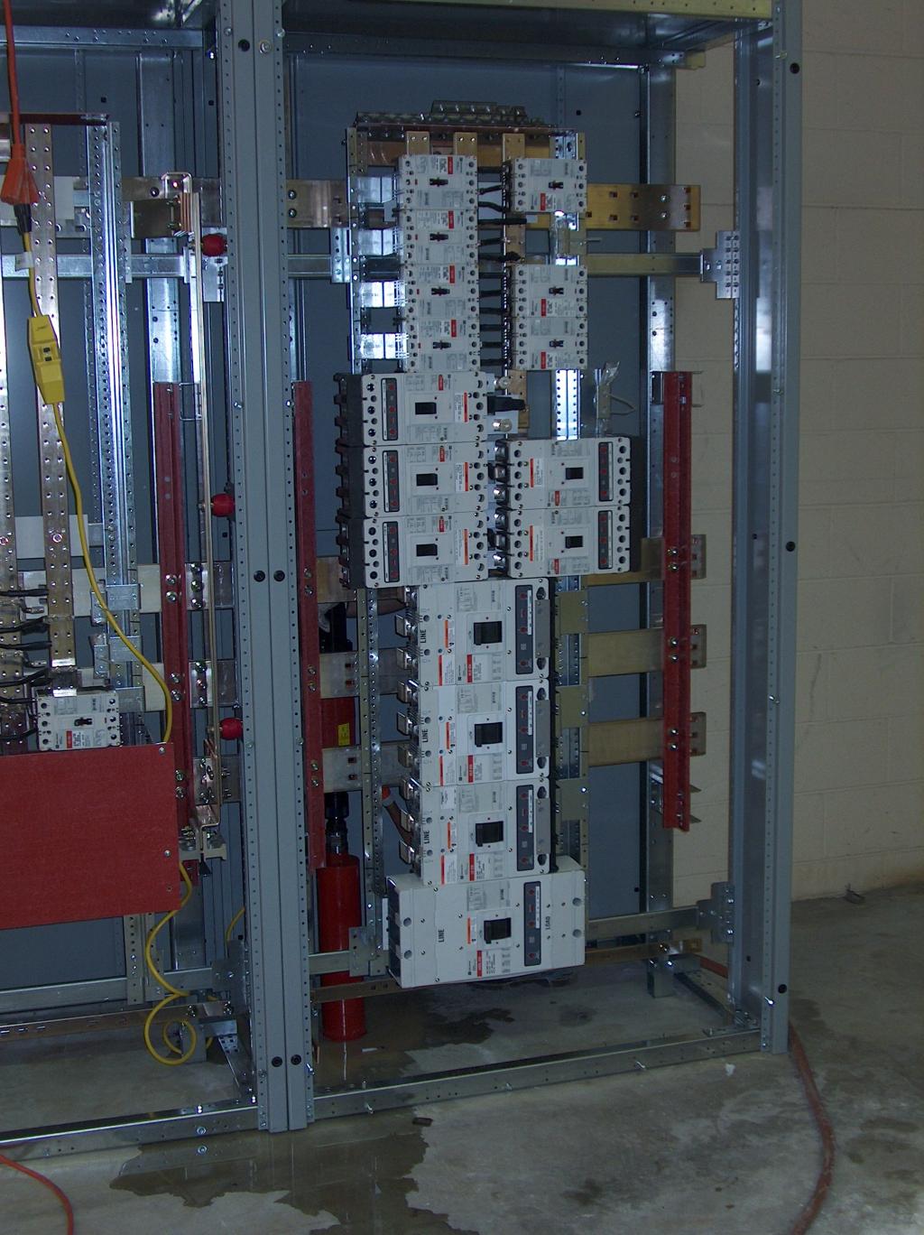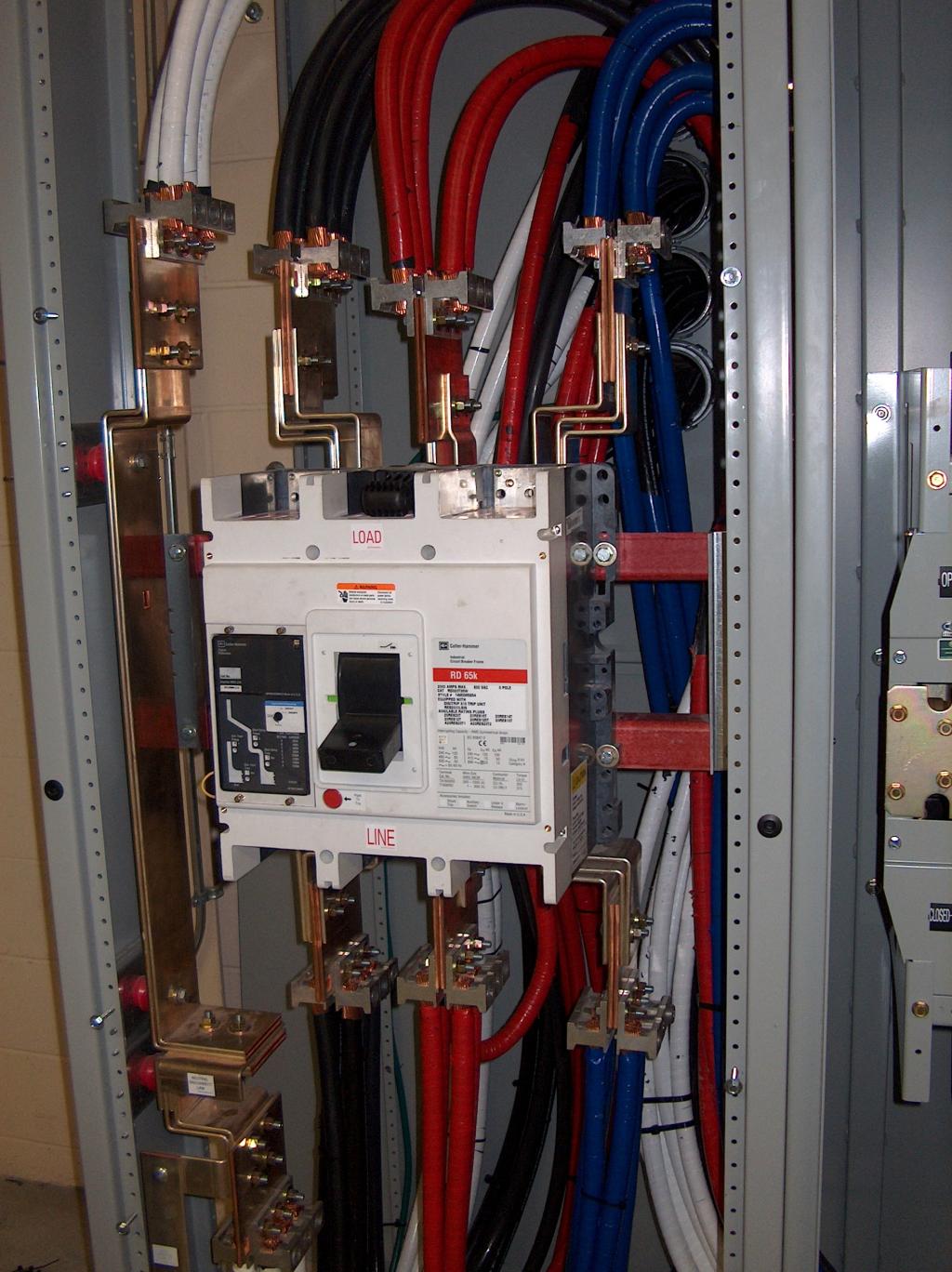 Main power wiring in the primary circuit breaker cabinet.