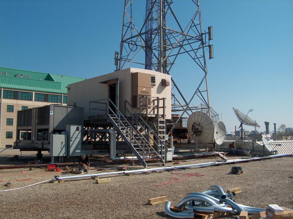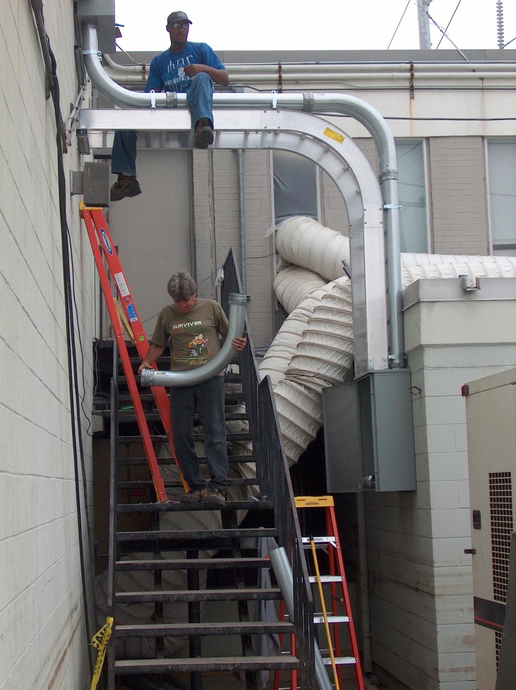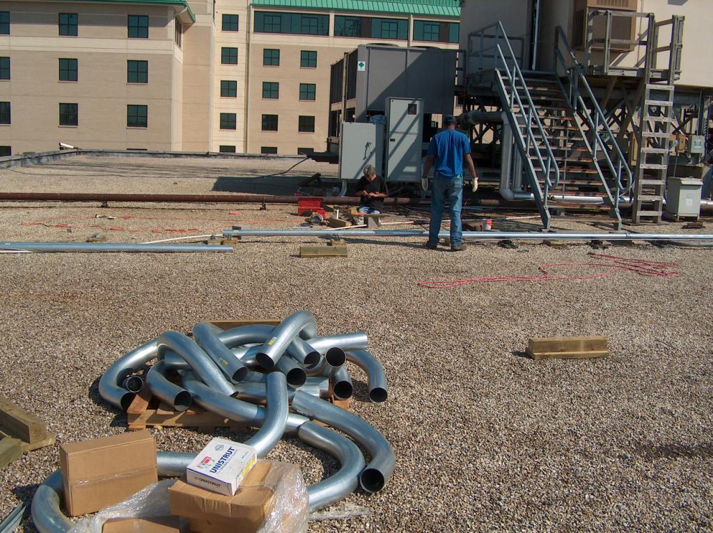 On the roof, the electricians are placing brand new conduit and wires for the air conditioning systems and the cellular building.