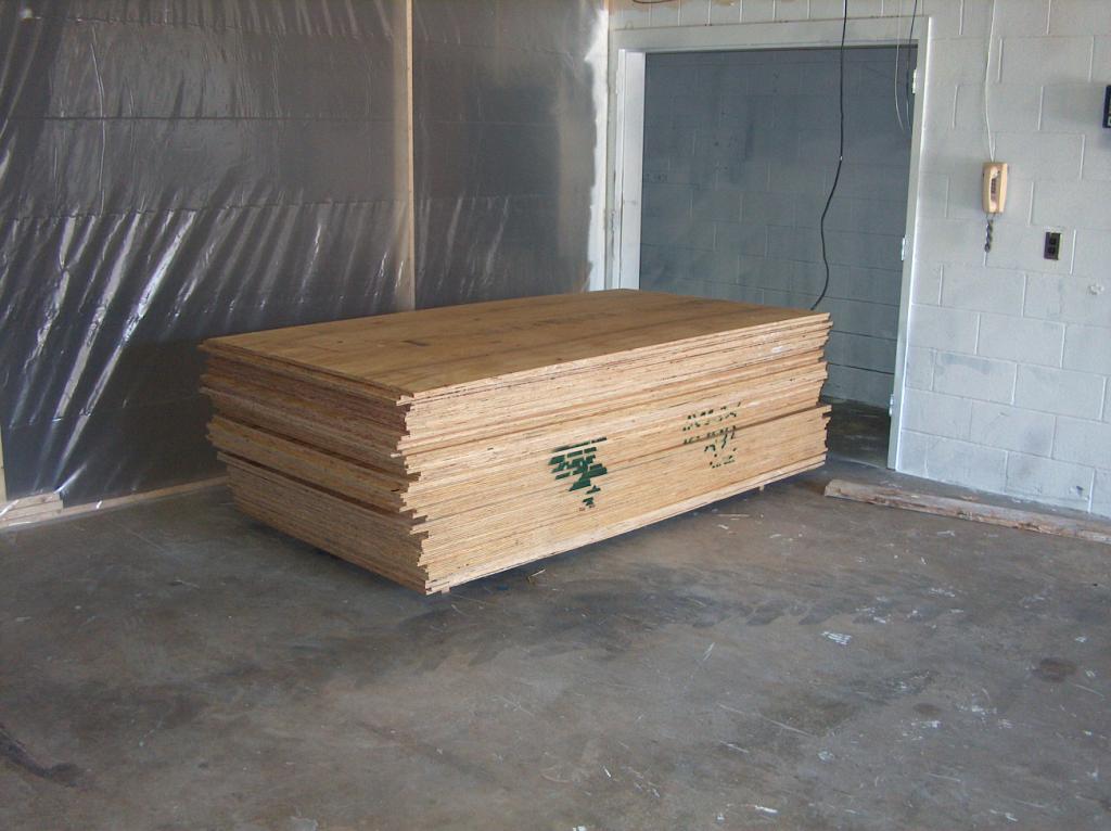 The arrival of some plywood signals the start of construction of the temporary work areas in the garage and main studio.