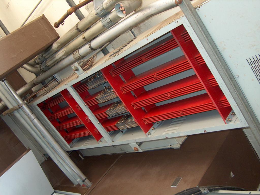 These are the old power busses from the transformer room to the old main power panel. Each red buss is made from five sections of solid copper bar. Each bar measures six inches wide by three-eights of an inch thick. The total power capacity of the busses is one megawatt, which could supply about one hundred houses.