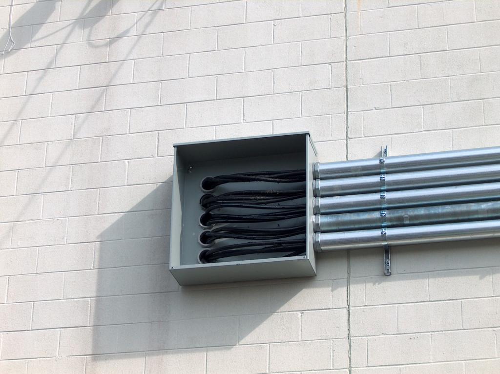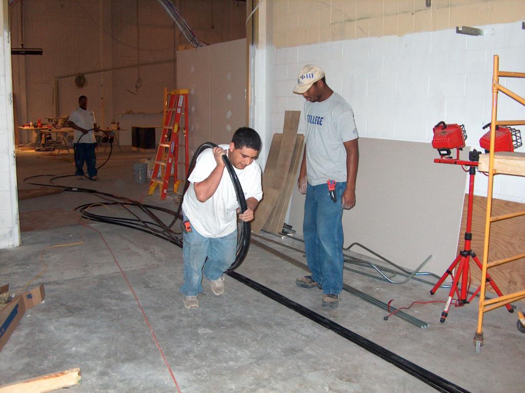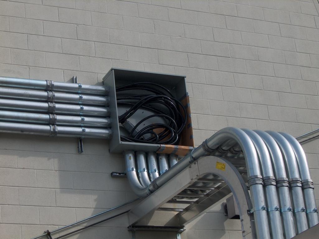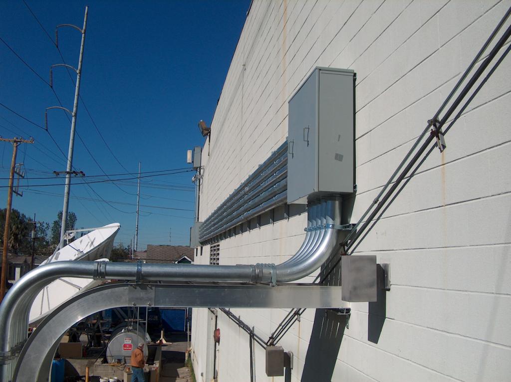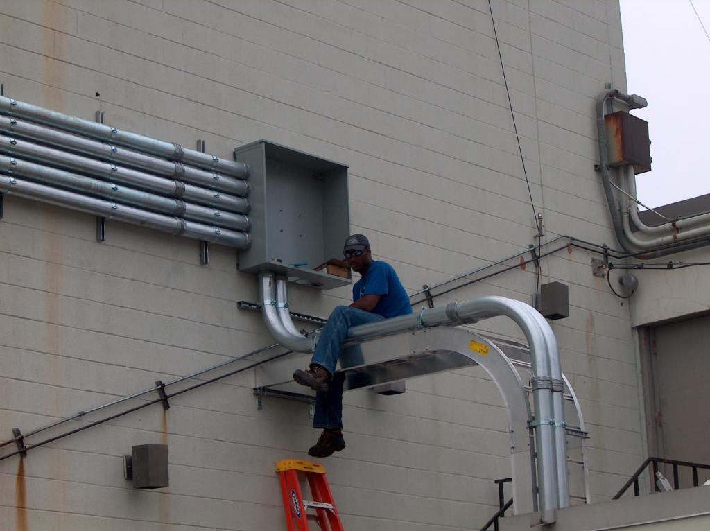 The electricians at work installing the outside electrical conduits.