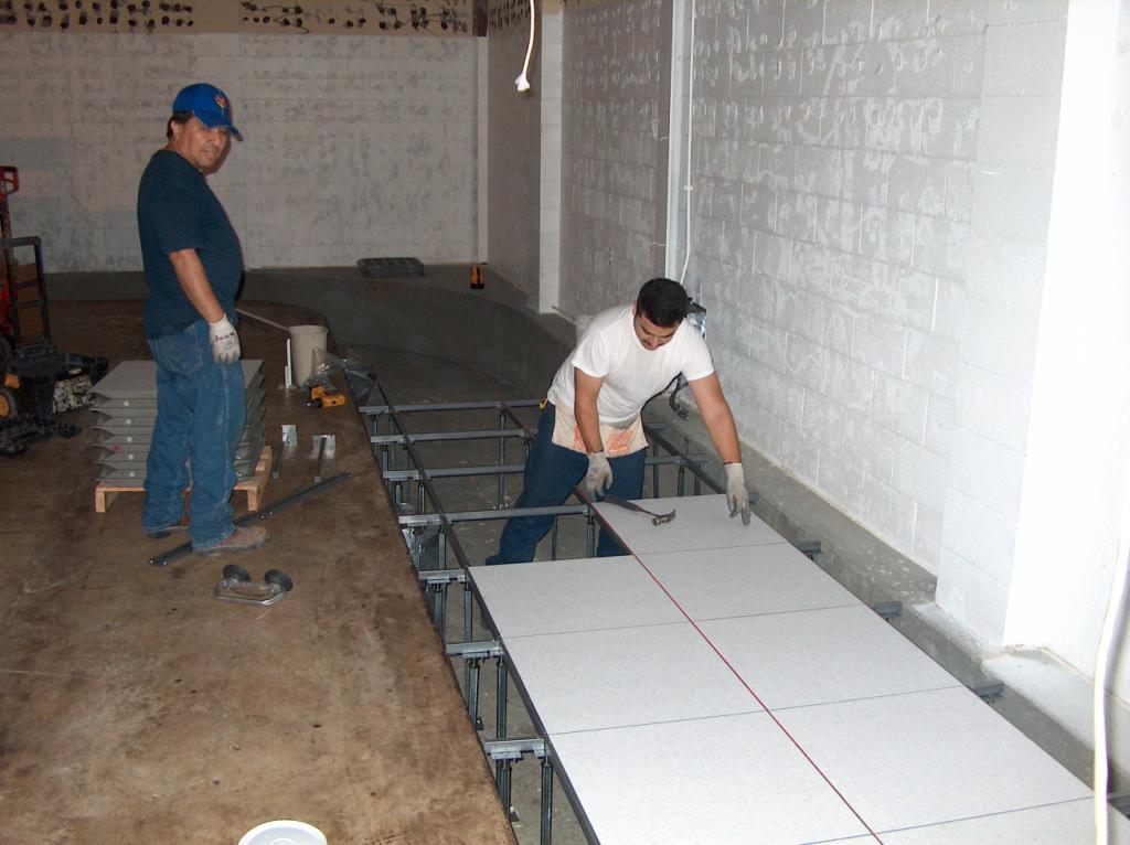 The construction crew at work installing the computer flooring.