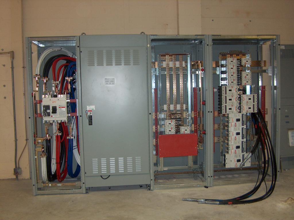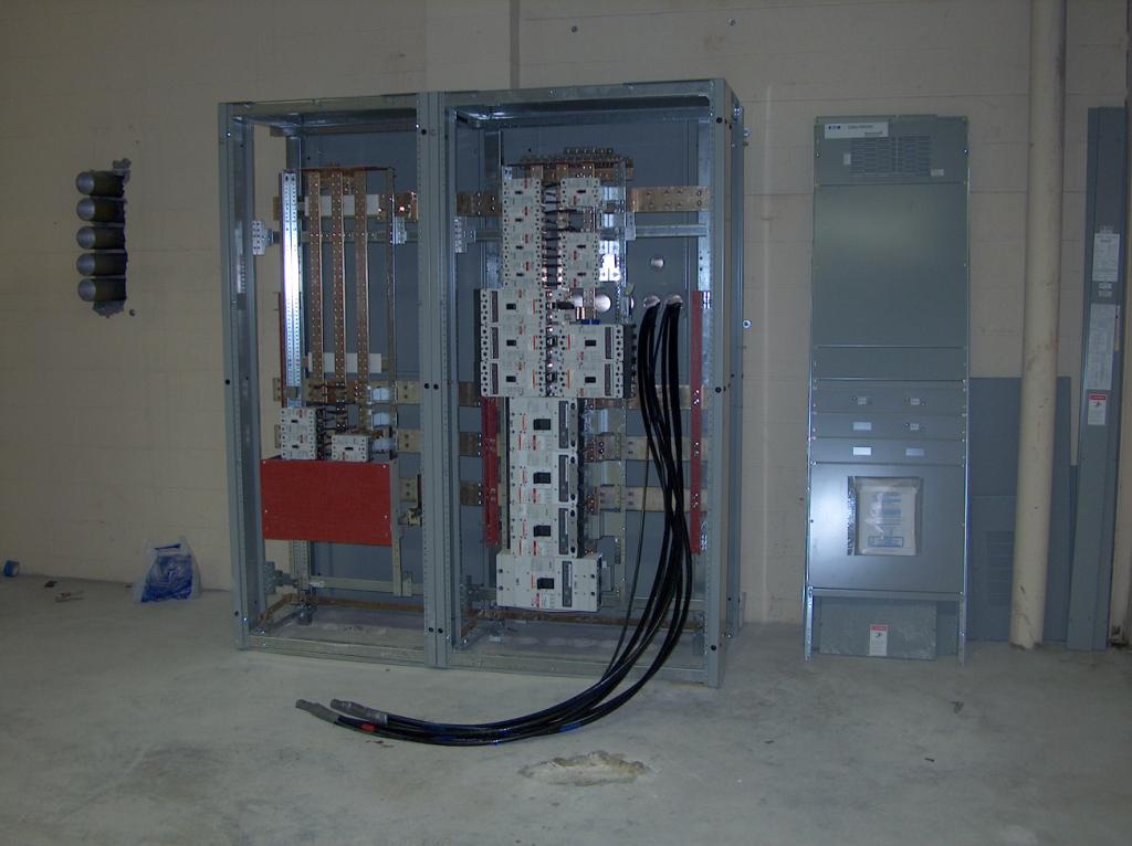 The main power panels. Power comes in from Entergy through the left panel and the main circuit breaker. The closed panel contains the automatic transfer switch that transfers from Entergy to the emergency generator. The right hand pair of cabinets are the Main Distribution Breakers which feed the various sub panels throughout the building.