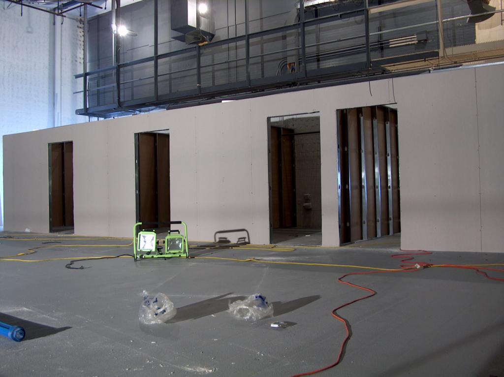 Sheetrock has been installed on the walls of the news room offices.