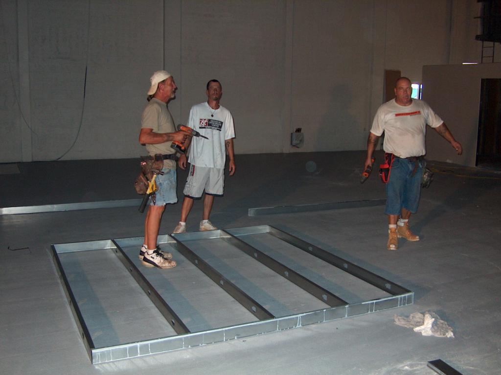 The carpenters assembling a wall section for installation in one of the edit rooms.