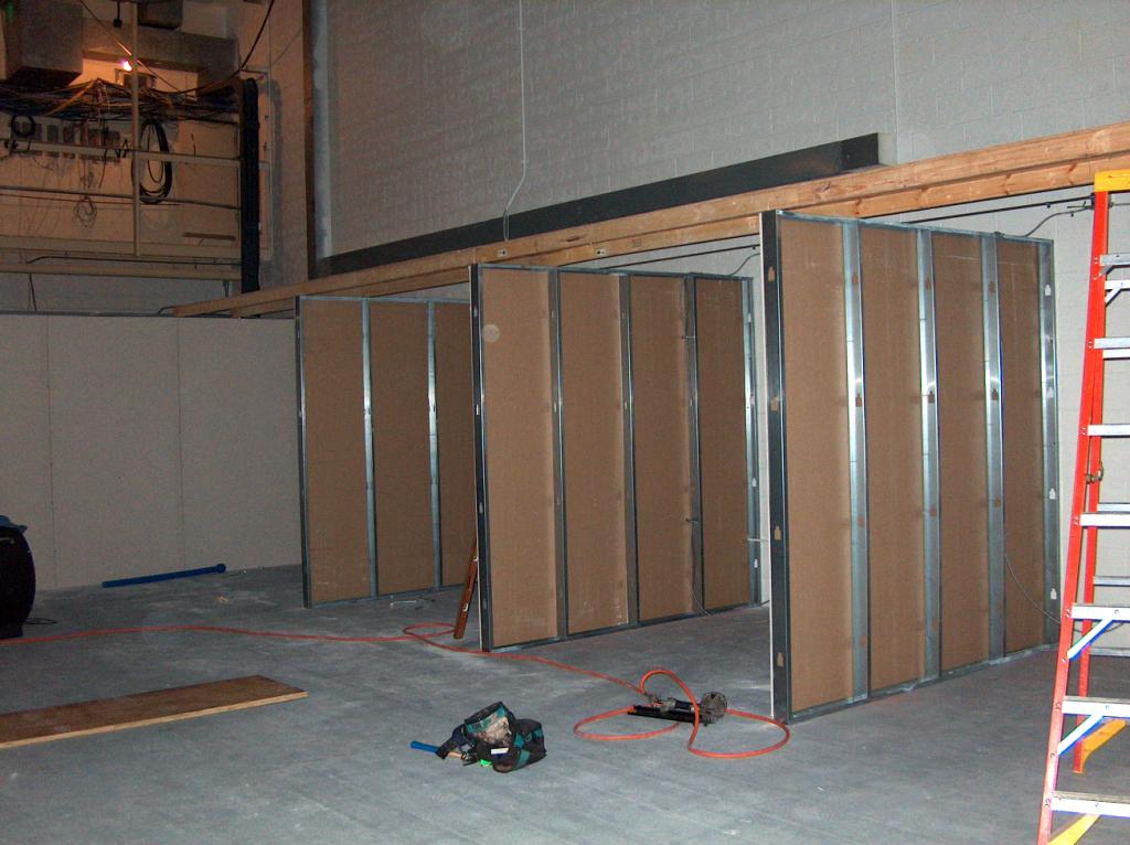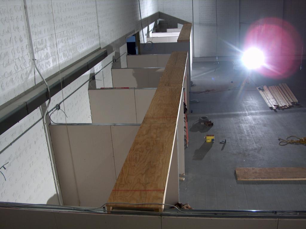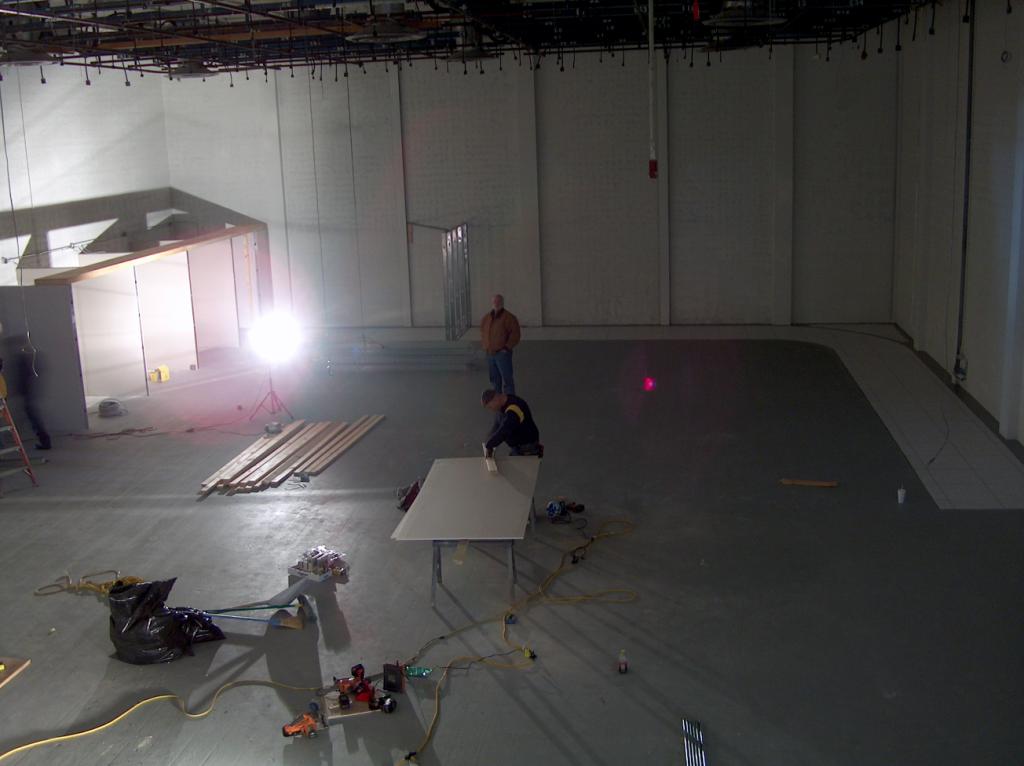 The carpenters are starting construction of the new temporary control room just outside the studio,. This was the old Purple Room.