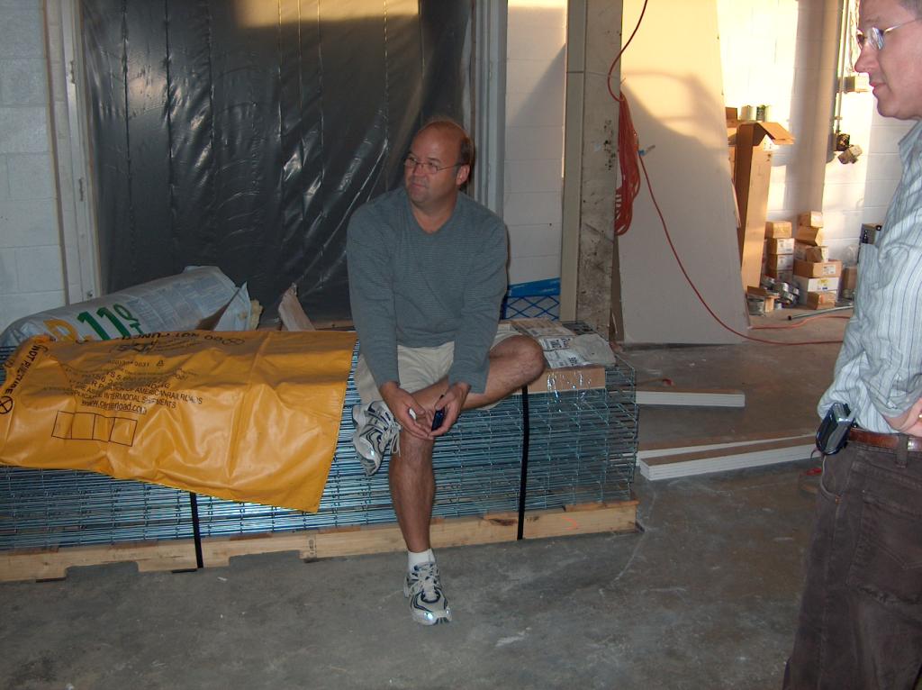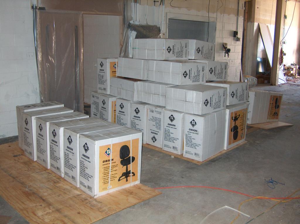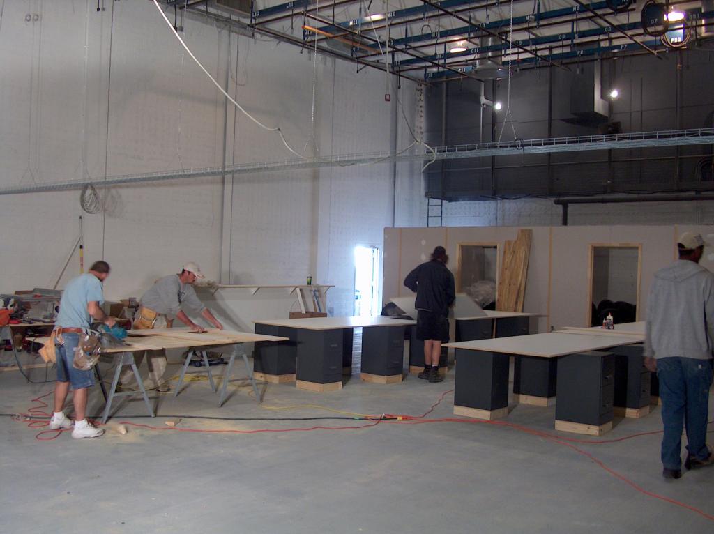 Meanwhile, the carpenters are assembling the desks and file cabinets.