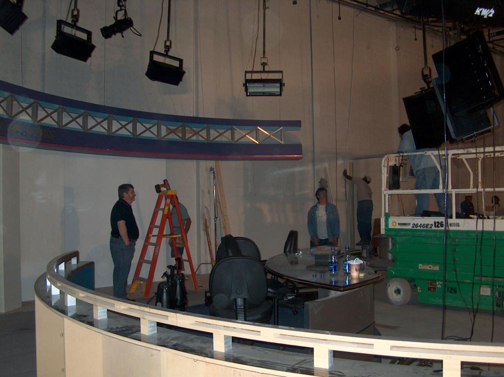 Getting the set and the lights ready for the first broadcast.