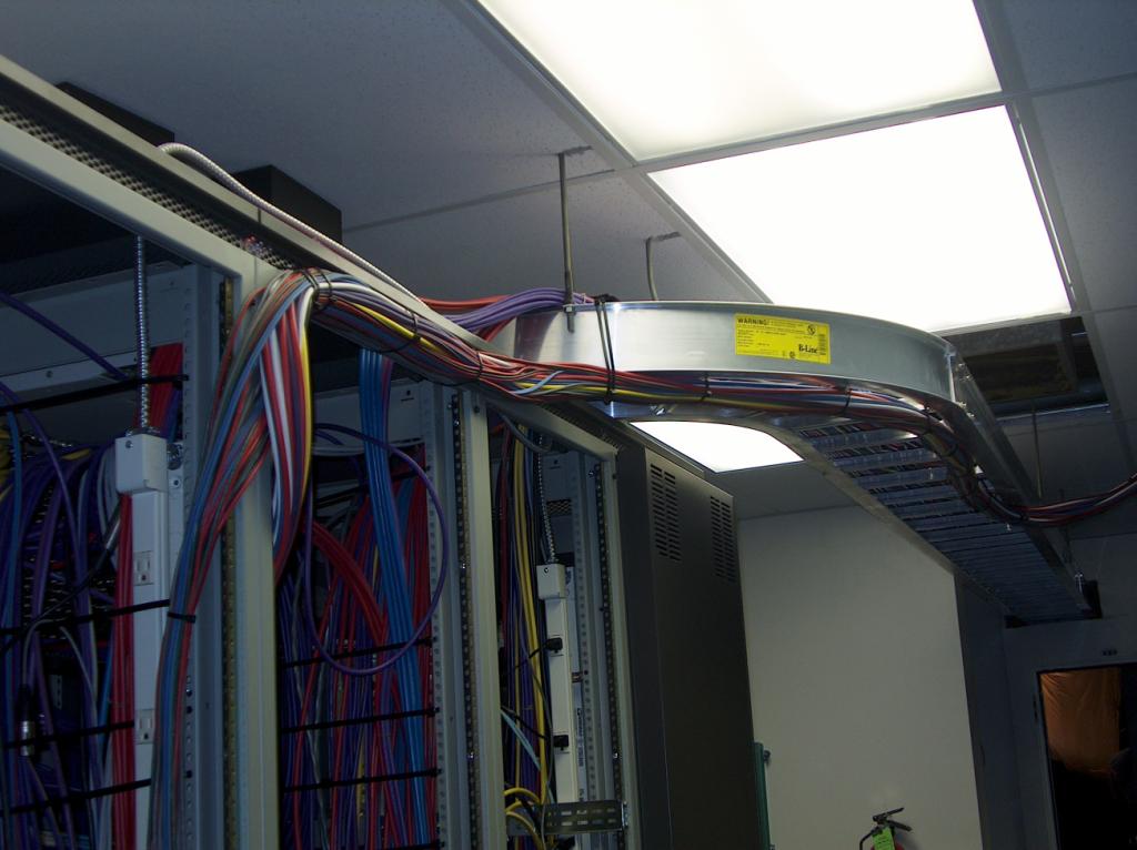 The temporary wires run overhead across the racks and up to a cable duct.